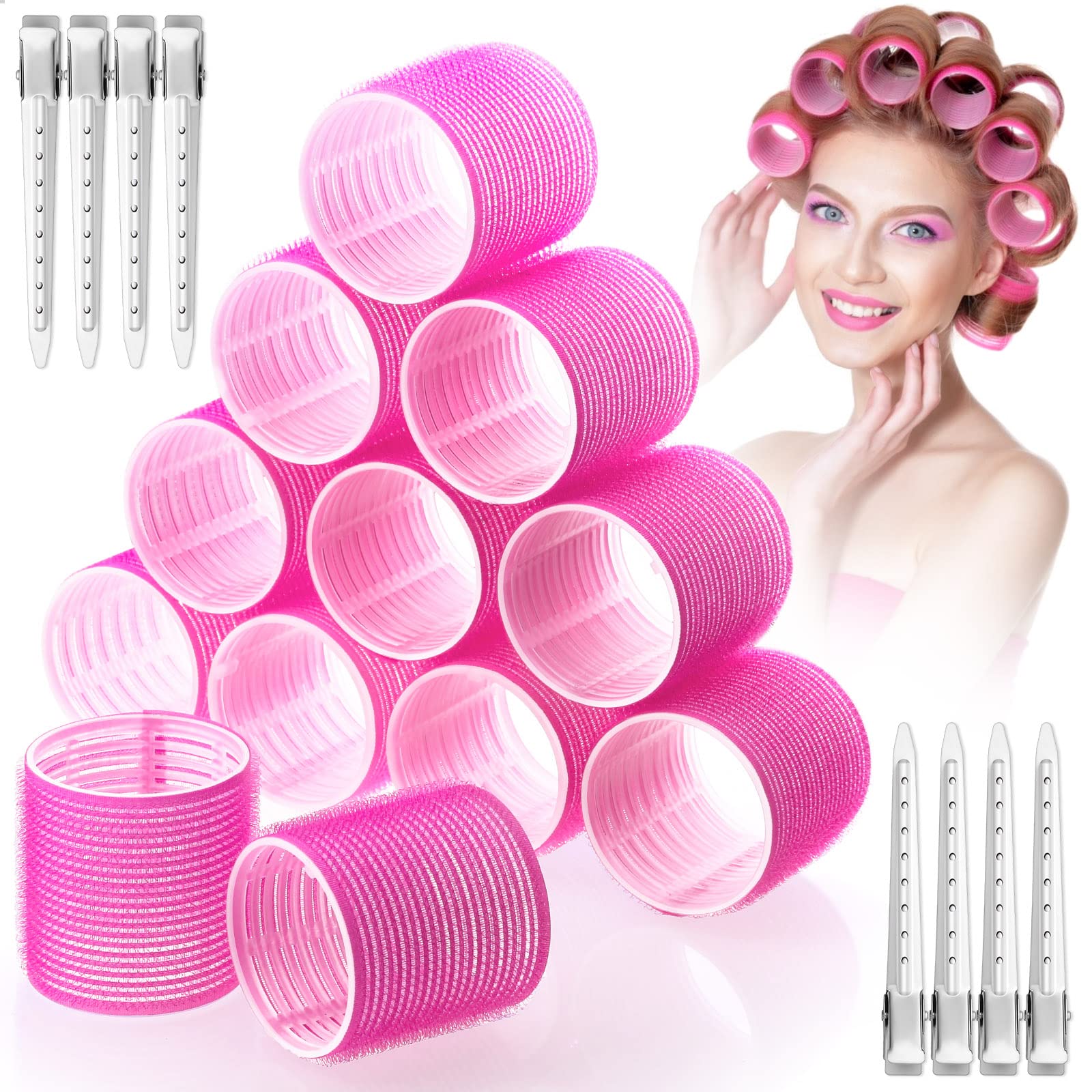 Jumbo Hair Curlers Rollers, 24Pcs Hair Rollers Set with 12Pcs 60mm Jumbo Hair Curlers Self Grip Holding Rollers and 12Pcs Hair Clips for Long Medium Hair Bangs Volume (Rose Red)